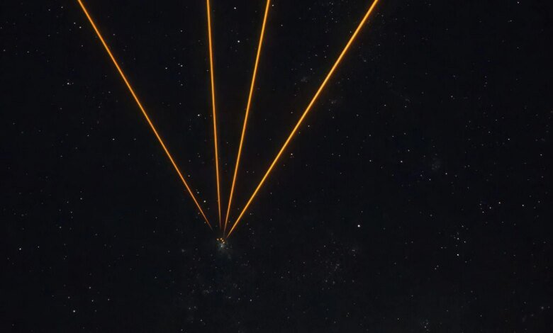 While this image was captured in Chile, the laser beams were targeted at a point 56 miles (90 kilometers) above Earth’s surface.