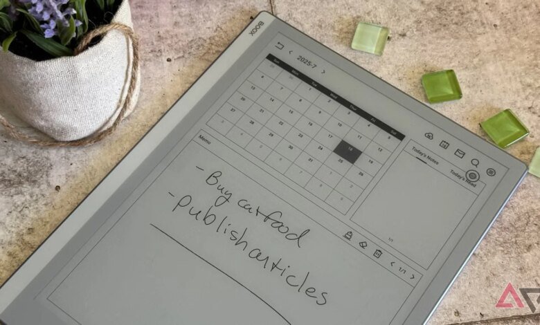 However, I don’t just consume content on my Boox Go 10.3 — it’s fantastic for taking notes and keeping my schedule. It has a capacitive layer on the display and a Boox stylus touch layer with 4,096 levels of pressure sensitivity. There’s almost no input delay, and combined with the sharp E Ink display, it looks and feels like I’m actually writing on the glass.