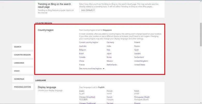 - Go to theBing Settings menuand locate theCountry/Regionsection.