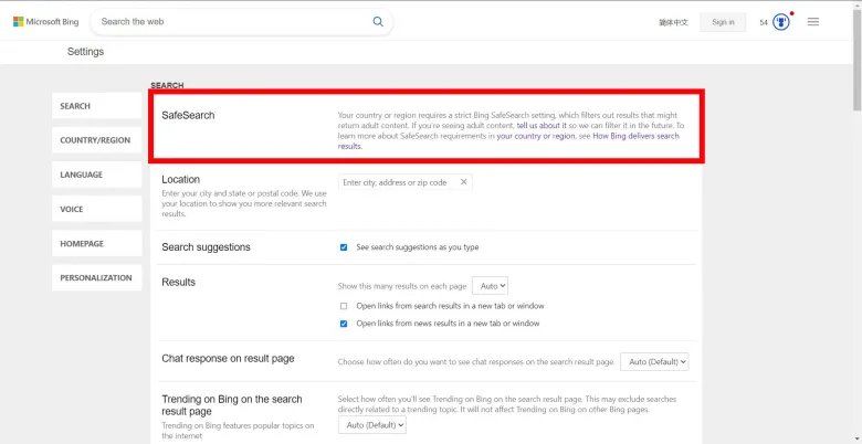 If you’re located in China, India, Indonesia, Korea, Malaysia, the Middle East, Singapore, Thailand, or Turkey, Bing’s SafeSearch might be set to Strict mode.