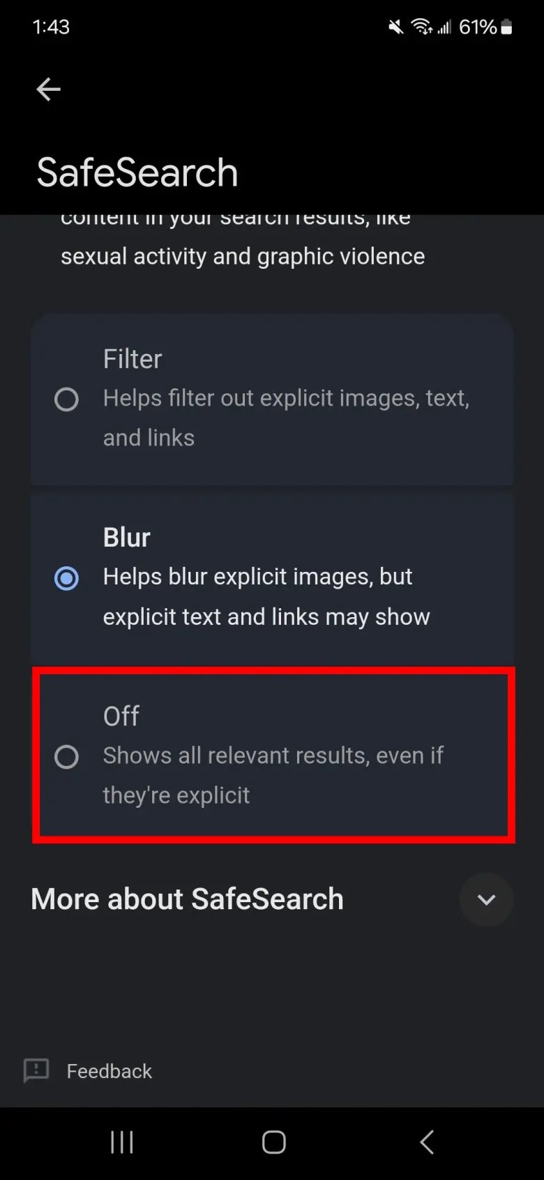 Google SafeSearch also offers aBluroption, which blurs explicit images. However, it may still serve you explicit links and text.