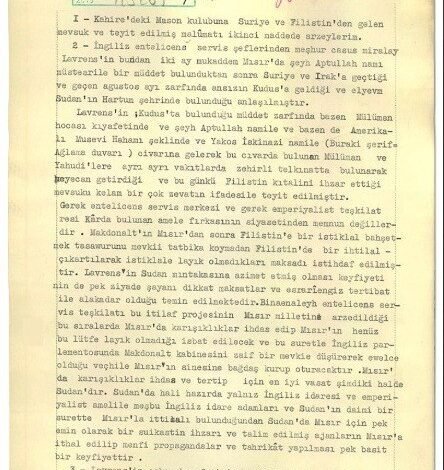وجاء في نص الوثيقة: “في الفقرة الثانية، وردت إلى النادي الماسوني في القاهرة معلومات موثوقة من سوريا وفلسطين، تؤكد أن العقيد لورانس، أحد أبرز قادة الاستخبارات البريطانية، غادر مصر بعد إقامته فيها لفترة، واتخذ اسما مستعارا هو ‘الشيخ عبد الله‘، ثم توجه إلى سوريا والعراق، قبل أن يصل فجأة إلى القدس في أغسطس 1929.”