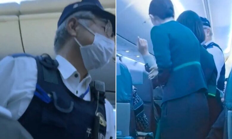 A video taken on board the plane by a fellow traveler shows a confrontation between cabin crew and the disruptive passenger. One clip shows police boarding the aircraft after landing back in Narita.